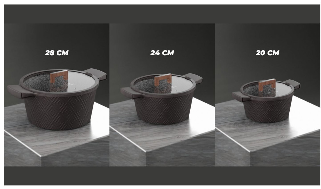 20, 24 y 28 cm y el cazo de