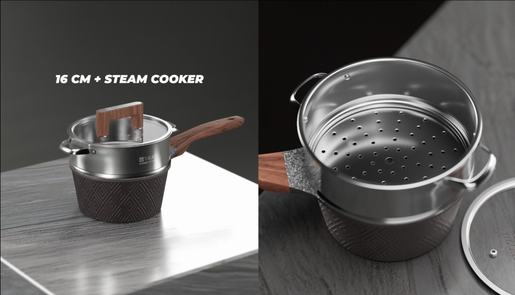 acero inoxidable 304 con asas, compatible con el cazo de 16 cm y su tapa.