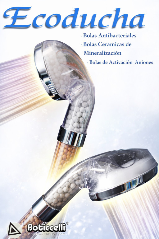 La Ecoducha Boticcelli es una revolucionaria ducha que limpia y tonifica la piel sin necesidad de jabones, Cabezal con disco de finísimos microporos que rompen los agregados moleculares del agua liberando gran cantidad de iones negativos. (Efecto Lénard). Filtro de cerámicas con propiedades beneficiosas para la salud y bienestar: activan el metabolismo y alivian la fatiga, suavizan el agua, reducen el cloro, refuerzan la inmunidad de la piel y eliminan los olores. Filtro de partículas, elimina del agua sedimentos, arenas, óxidos... y ayuda a mantener la piel limpia. Debido a la micronización del agua, libera de modo natural una enorme cantidad de iones negativos muy beneficiosos para la salud, a la vez que limpia, tonifica y desinfecta la piel sin necesidad de utilizar jabones u otros productos, elimina el cloro remanente en el agua, previene contra la caspa, espinillas, acné y caída del cabello, su uso continuado alivia la dermatitis atópica y la psoriasis.